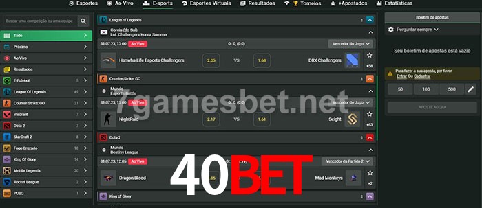 O 40bet oferece uma grande seleção de opções de apostas em e-sports com probabilidades competitivas